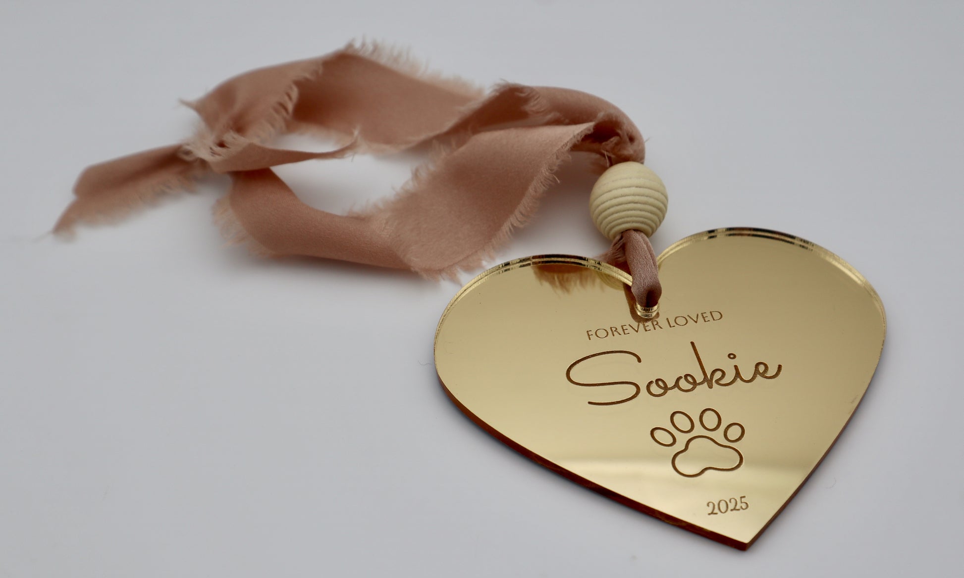 A heartfelt way to honor the pet who left paw prints on your heart. This personalized heart-shaped ornament is a timeless keepsake — perfect for holiday trees, memorial shelves, or year-round display.